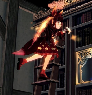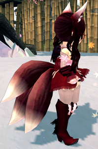 two-toned eyes until later. She then had short bob hair with a fringe, which was a staple until they released adorable twin-tails in which would finalize her design. That doesn't mean she wouldn't change her hair style every so often but the twin-tails is her staple. She then also has two-toned eyes, which varies in which color scheme she's in. But her base colors consist of dark red or maroon, pink, cherry grey, dark grey or black, and white. Her personality is basically mirrored by my personality with extra attributes. She also represents the kind of person I wish to be as she has a lot more confidence and self worth in herself. The reason she is a "Kitsune/Kumiho" was originally because of her design, (she had the five-tail cosmetic) in the game. However I did become obsessed with the idea of yokai's and foxes, so it all came together from there. Especially when my concentration works in high school for art was all about the kitsune yokai and tying that idea with the experiences and memories i've had in life. Overall her existence wouldn't be so important if it weren't for my partner at the time who very much loved the idea of her.